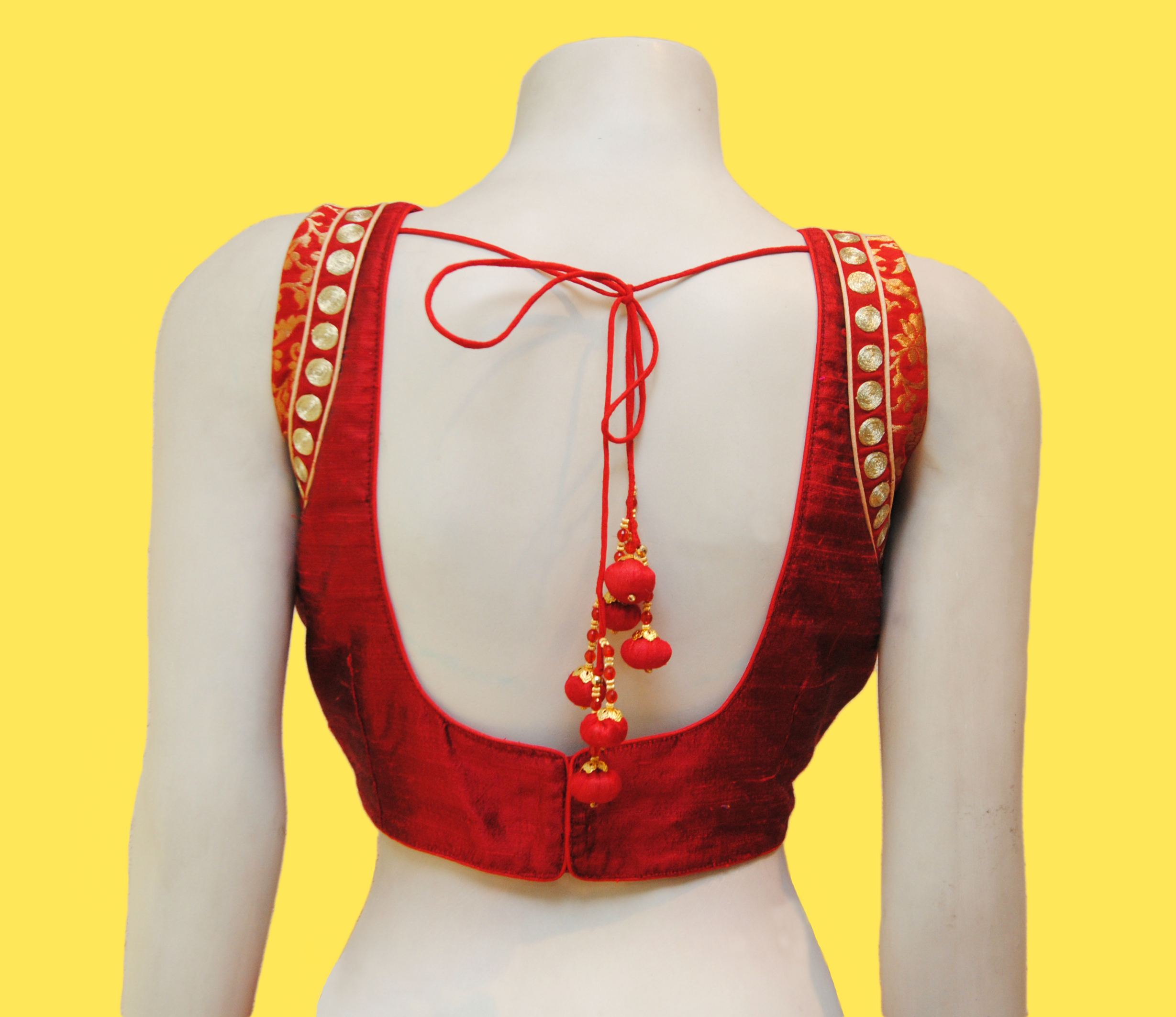 Red pure raw silk based cup fitted blouse with shoulder patch & kasab emb. buta. Sleeves are given extra.