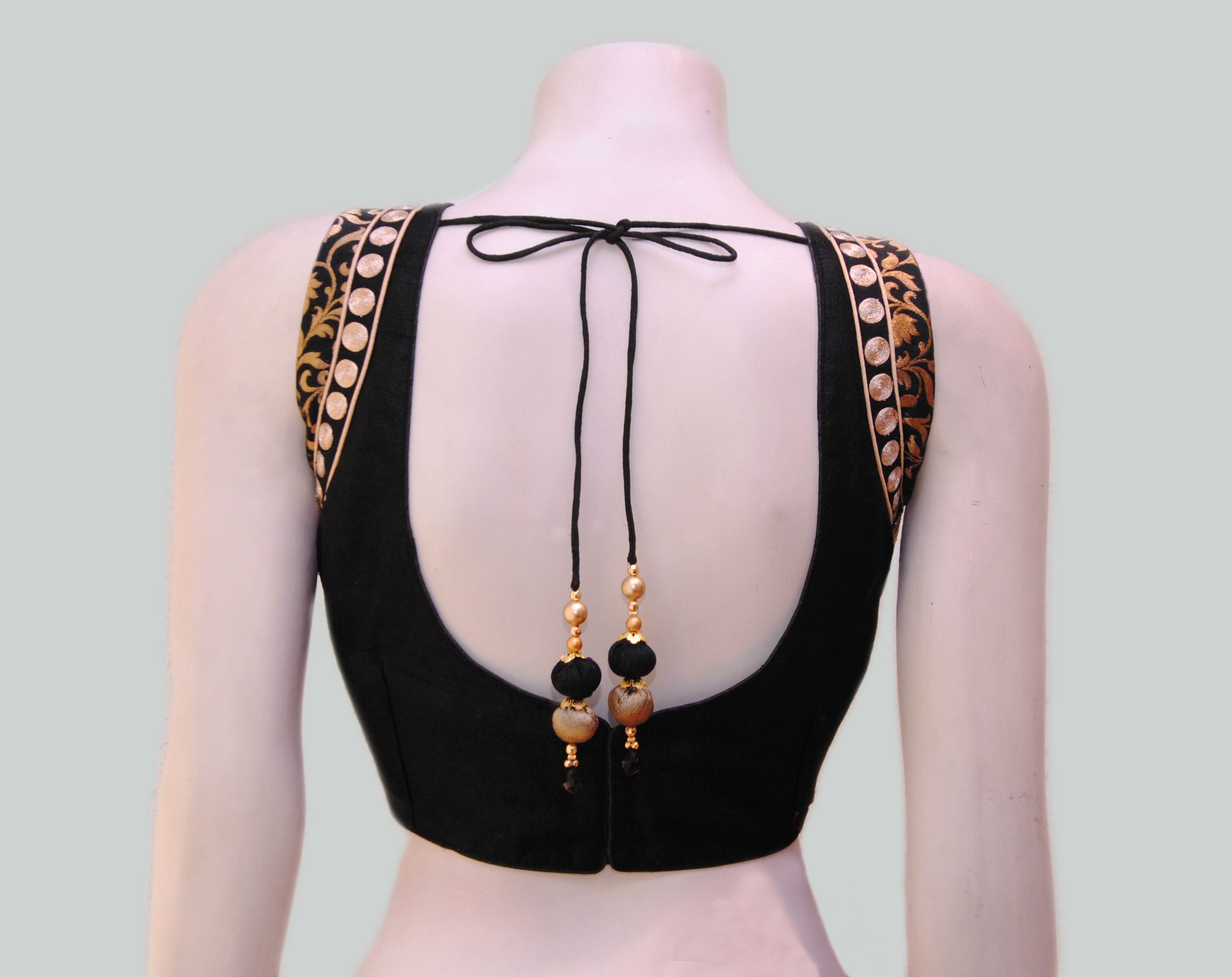 Black pure raw silk based cup fitted blouse with shoulder patch & kasab emb. buta. Sleeves are given extra.